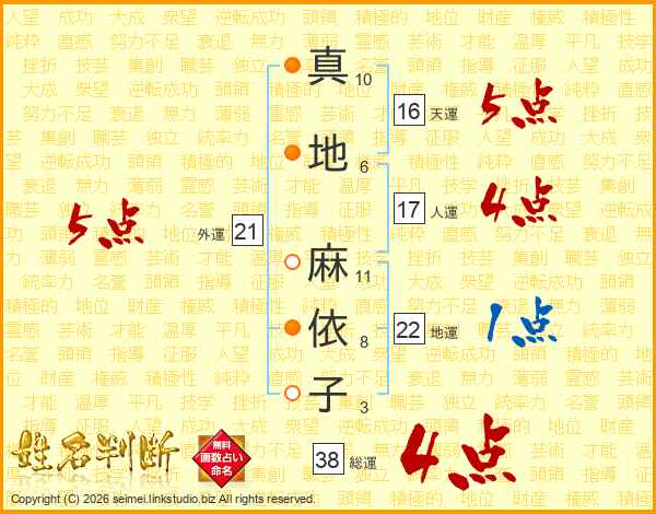真(10画)地(6画) 麻(11画)依(8画)子(3画)
