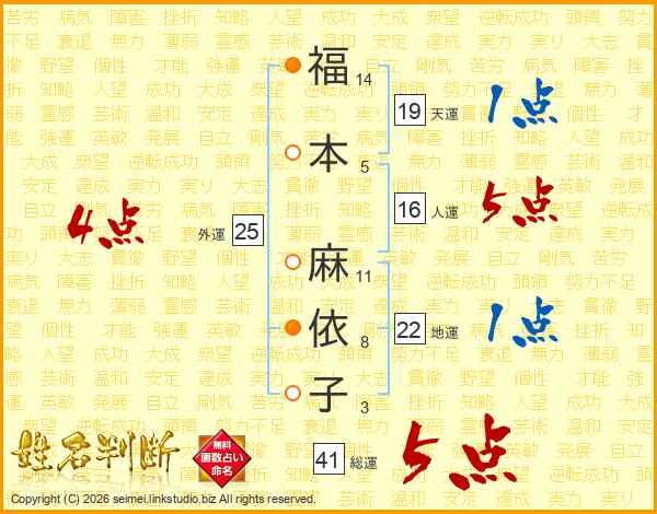 福(14画)本(5画) 麻(11画)依(8画)子(3画)