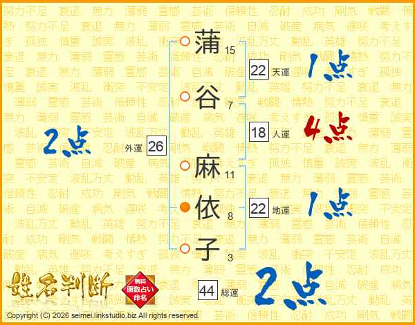 蒲(15画)谷(7画) 麻(11画)依(8画)子(3画)