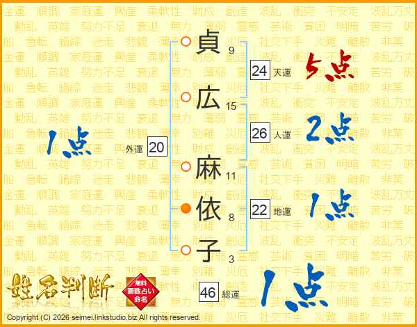 貞(9画)広(15画) 麻(11画)依(8画)子(3画)