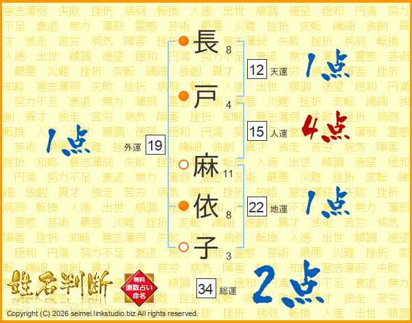 長(8画)戸(4画) 麻(11画)依(8画)子(3画)