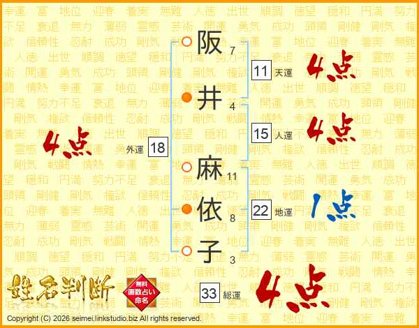 阪(7画)井(4画) 麻(11画)依(8画)子(3画)