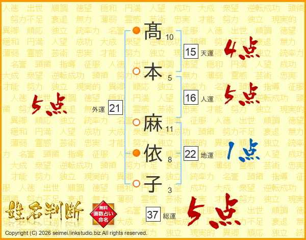髙(10画)本(5画) 麻(11画)依(8画)子(3画)