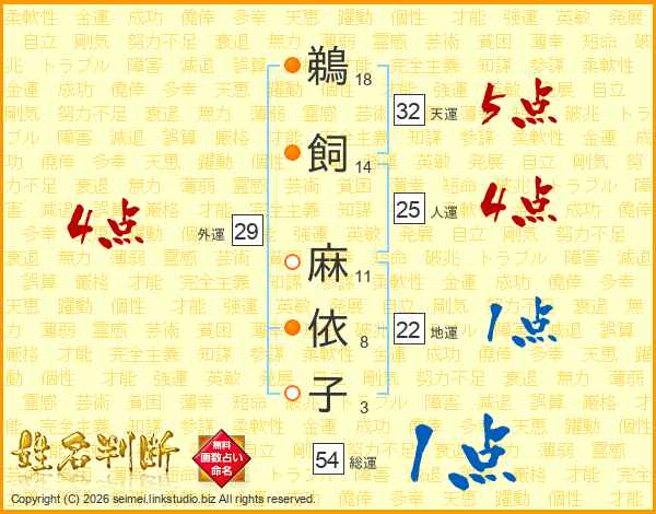 鵜(18画)飼(14画) 麻(11画)依(8画)子(3画)