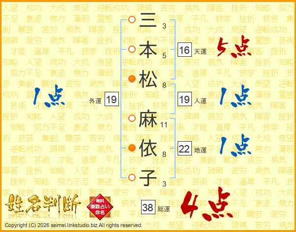 三(3画)本(5画)松(8画) 麻(11画)依(8画)子(3画)