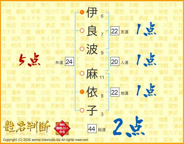 伊(6画)良(7画)波(9画) 麻(11画)依(8画)子(3画)