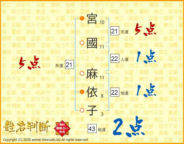 宮(10画)國(11画) 麻(11画)依(8画)子(3画)
