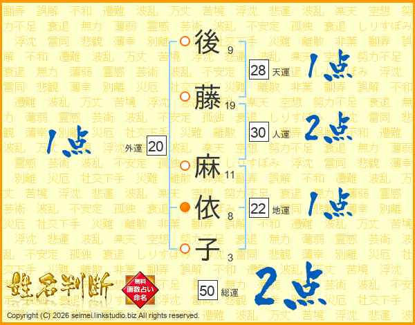 後(9画)藤(19画) 麻(11画)依(8画)子(3画)