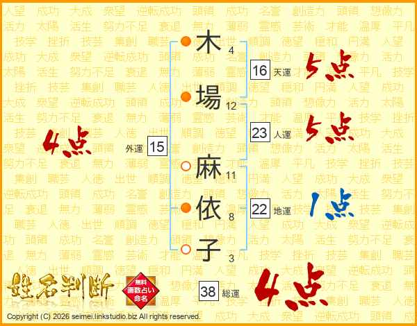 木(4画)場(12画) 麻(11画)依(8画)子(3画)