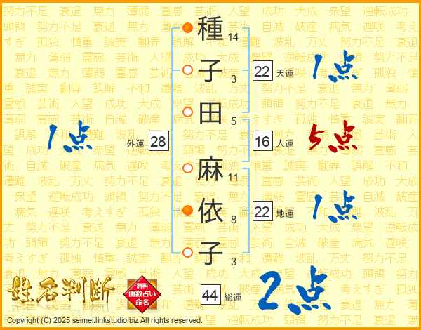 種(14画)子(3画)田(5画) 麻(11画)依(8画)子(3画)