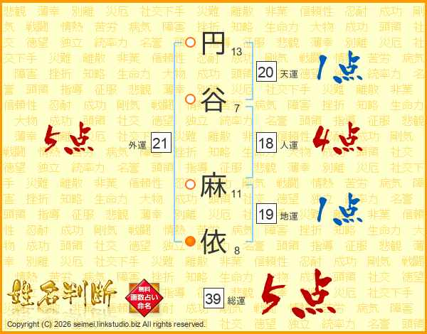 円(13画)谷(7画) 麻(11画)依(8画)