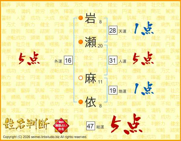 岩(8画)瀬(20画) 麻(11画)依(8画)