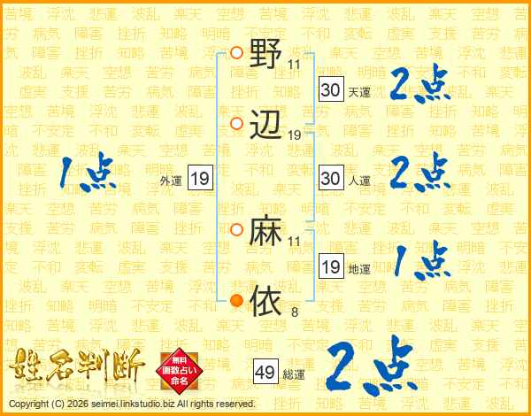 画数の奇数(○陽)と偶数(●陰)の配列で吉凶を占います。どちらかにかたよる名前は大凶名で避ける必要があります。画数の奇数偶数。