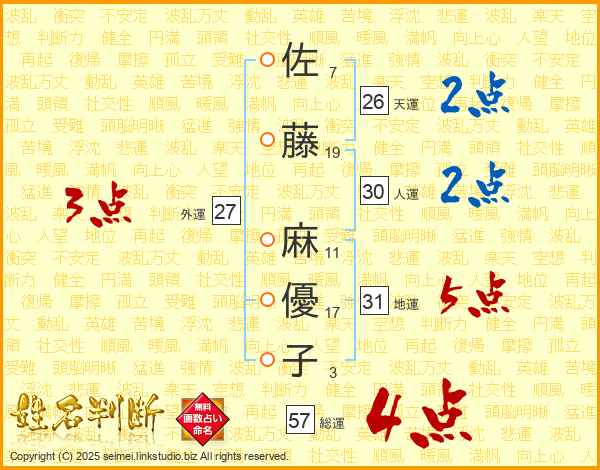 佐(7画)藤(19画) 麻(11画)優(17画)子(3画)