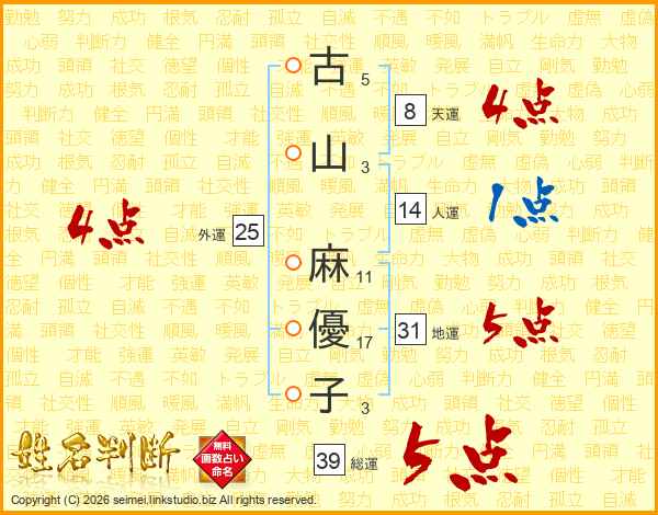古山麻優子さんの総運は39画の5点!