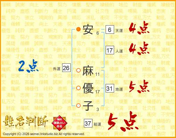 生活面を象徴する運勢です。外部から受ける影響力を表し、結婚運、家庭運や職場、環境への順応性を表します。総運から人運を引いた画数。姓や名が1文字の場合を除く。
