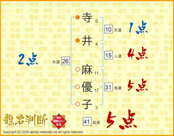 寺(6画)井(4画) 麻(11画)優(17画)子(3画)