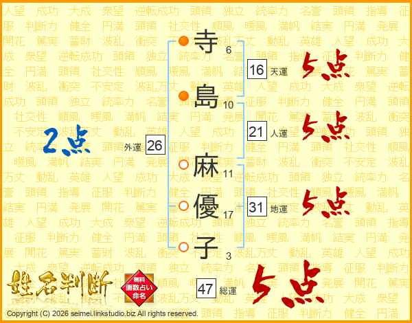 寺(6画)島(10画) 麻(11画)優(17画)子(3画)