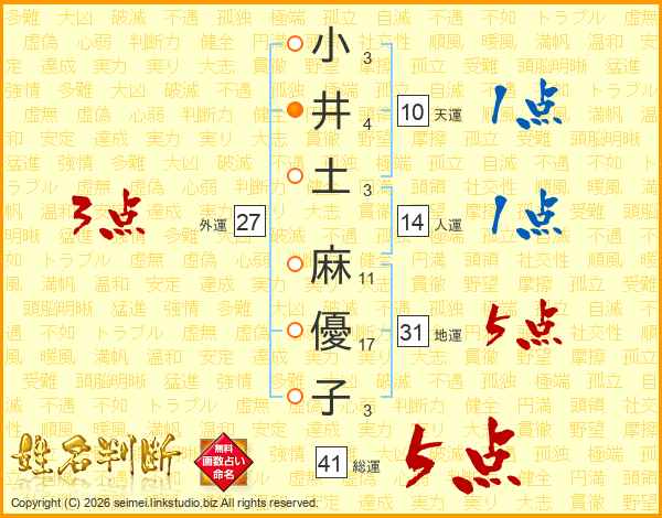 小(3画)井(4画)土(3画) 麻(11画)優(17画)子(3画)