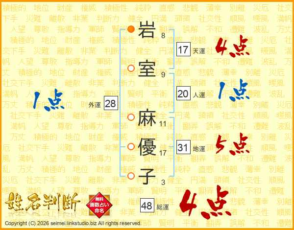 岩(8画)室(9画) 麻(11画)優(17画)子(3画)