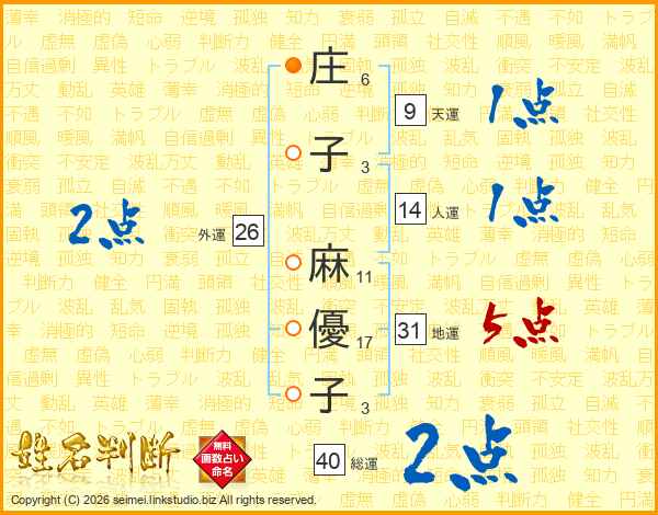 庄(6画)子(3画) 麻(11画)優(17画)子(3画)