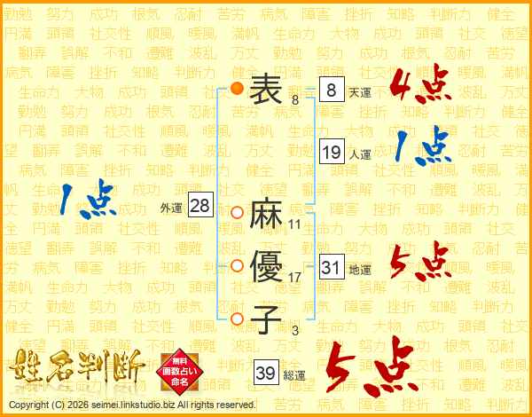 あなたの人生を表す1番重要な運勢です。生涯を通じて影響する総合運となり、主に50歳以降の晩年期に影響を及ぼします。苗字と名前の合計画数。
