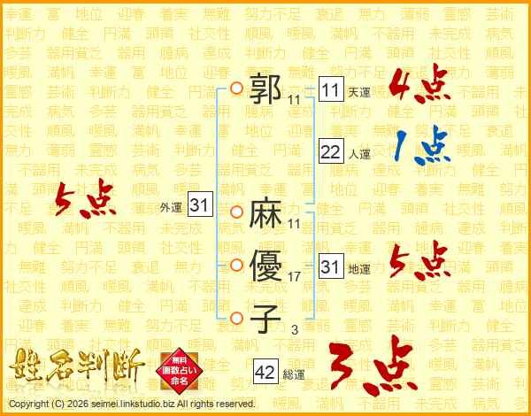 生活面を象徴する運勢です。外部から受ける影響力を表し、結婚運、家庭運や職場、環境への順応性を表します。総運から人運を引いた画数。姓や名が1文字の場合を除く。