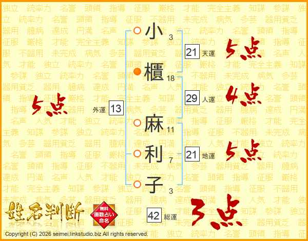 生活面を象徴する運勢です。外部から受ける影響力を表し、結婚運、家庭運や職場、環境への順応性を表します。総運から人運を引いた画数。姓や名が1文字の場合を除く。