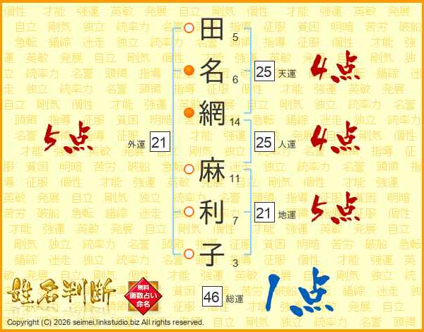 田(5画)名(6画)網(14画) 麻(11画)利(7画)子(3画)