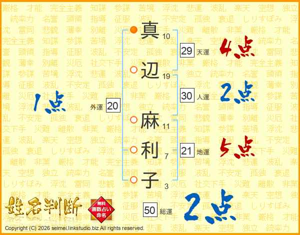 真(10画)辺(19画) 麻(11画)利(7画)子(3画)