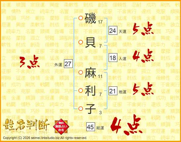 磯(17画)貝(7画) 麻(11画)利(7画)子(3画)