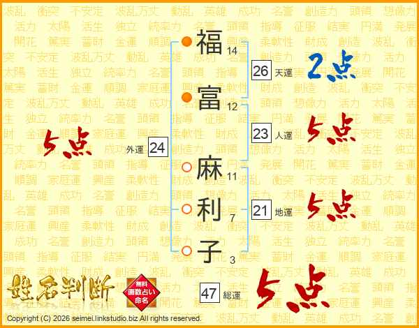 福(14画)富(12画) 麻(11画)利(7画)子(3画)