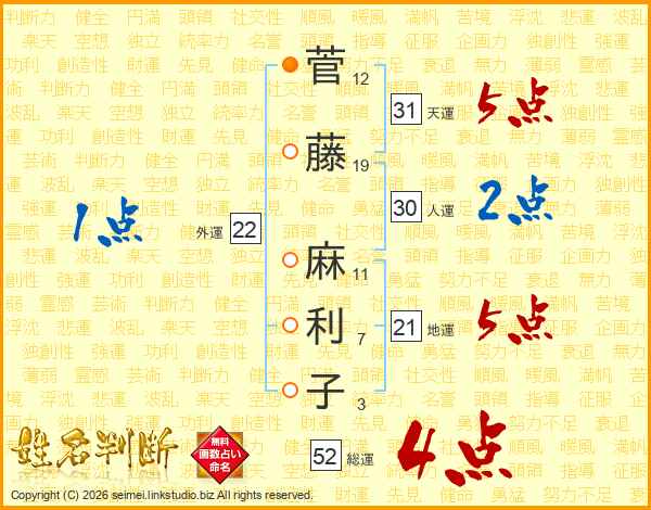 菅(12画)藤(19画) 麻(11画)利(7画)子(3画)