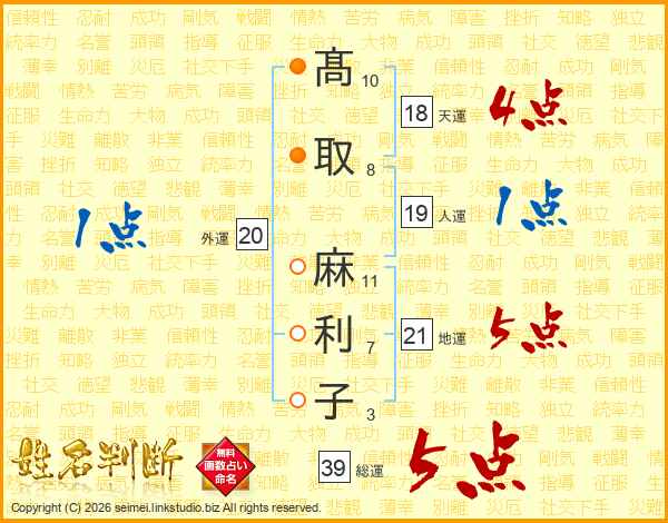 髙取麻利子さんの総運は39画の5点!