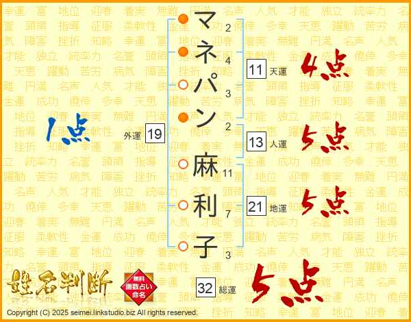 マ(2画)ネ(4画)パ(3画)ン(2画)  麻(11画)利(7画)子(3画)