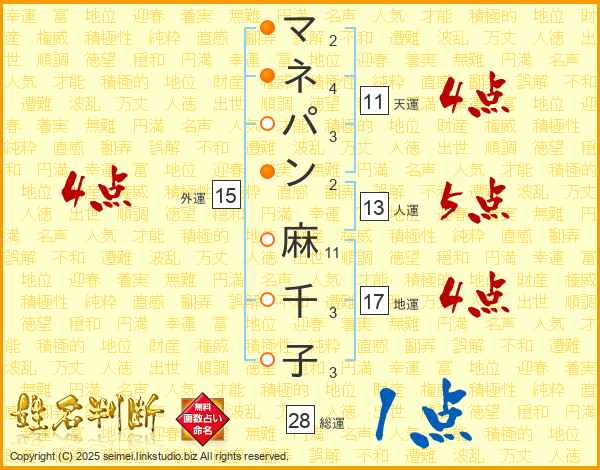 マ(2画)ネ(4画)パ(3画)ン(2画) 麻(11画)千(3画)子(3画)