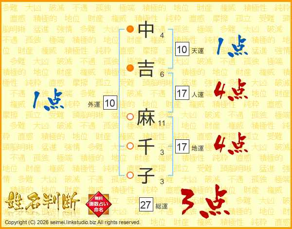 中(4画)吉(6画) 麻(11画)千(3画)子(3画)