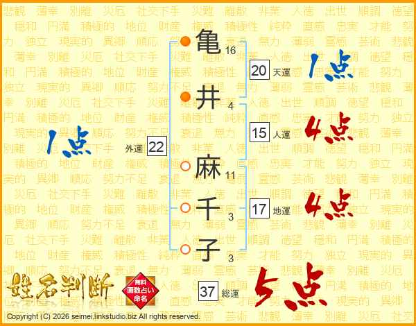 亀井麻千子さんの総運は37画の5点!