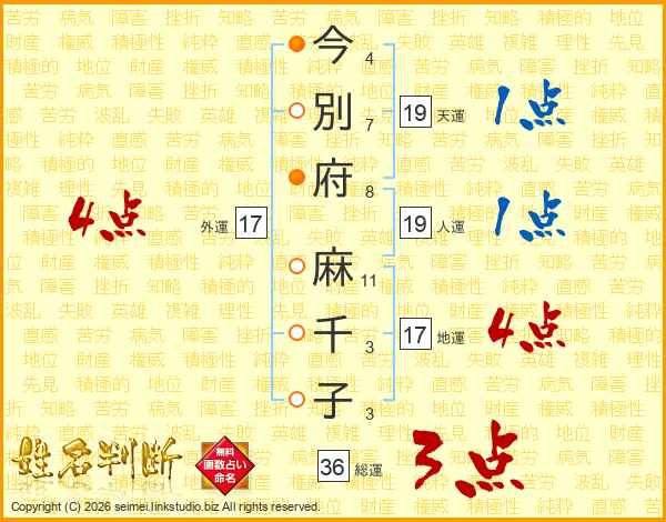 今(4画)別(7画)府(8画) 麻(11画)千(3画)子(3画)