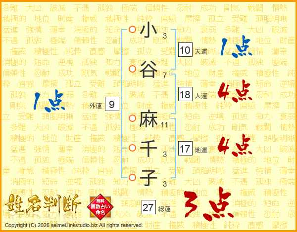 小(3画)谷(7画) 麻(11画)千(3画)子(3画)