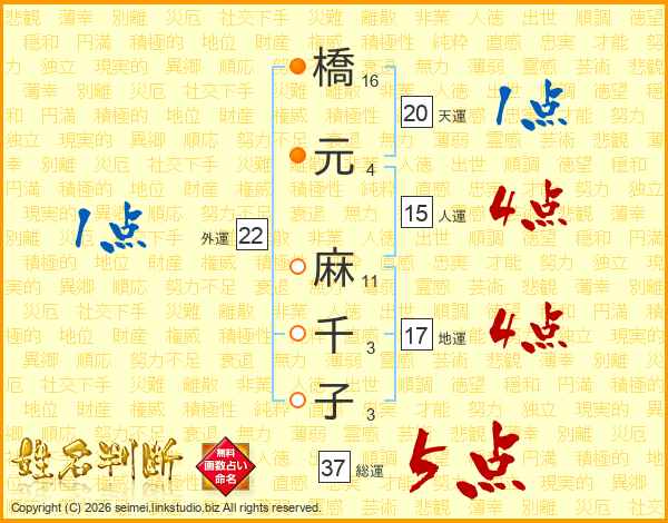 橋(16画)元(4画) 麻(11画)千(3画)子(3画)