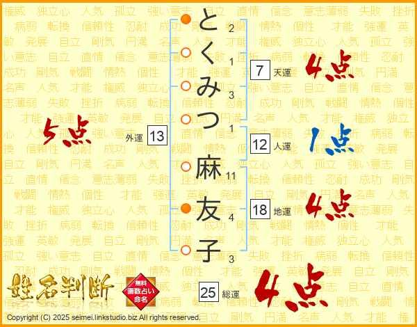 と(2画)く(1画)み(3画)つ(1画) 麻(11画)友(4画)子(3画)