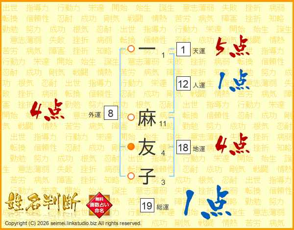 生活面を象徴する運勢です。外部から受ける影響力を表し、結婚運、家庭運や職場、環境への順応性を表します。総運から人運を引いた画数。姓や名が1文字の場合を除く。