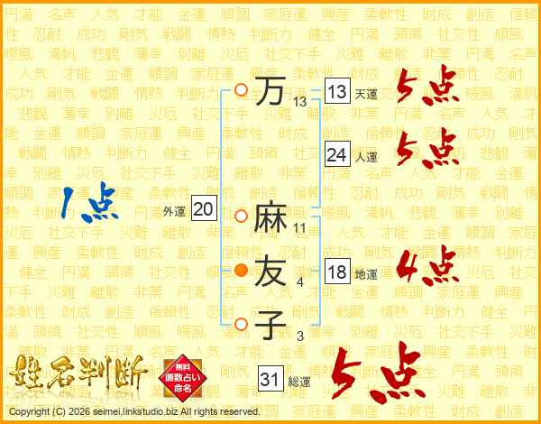 生活面を象徴する運勢です。外部から受ける影響力を表し、結婚運、家庭運や職場、環境への順応性を表します。総運から人運を引いた画数。姓や名が1文字の場合を除く。