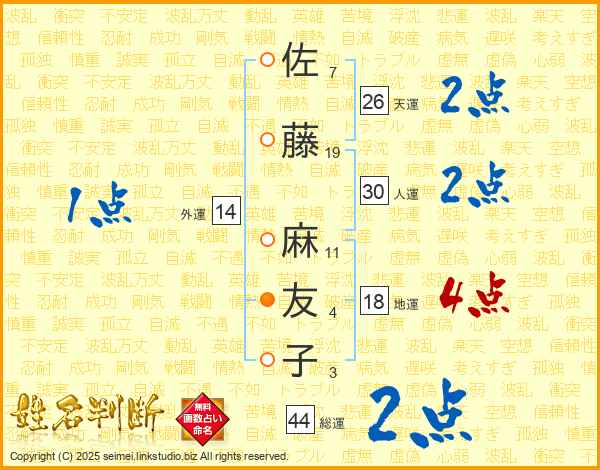佐(7画)藤(19画) 麻(11画)友(4画)子(3画)