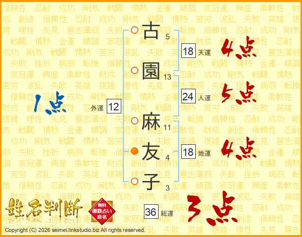古(5画)園(13画) 麻(11画)友(4画)子(3画)