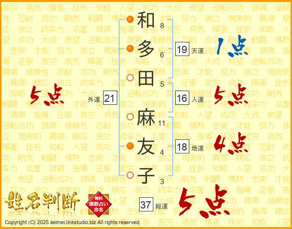 和(8画)多(6画)田(5画) 麻(11画)友(4画)子(3画)