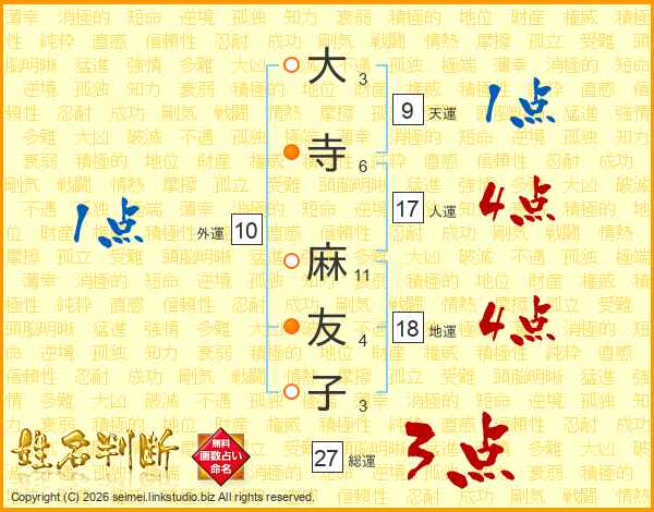 大(3画)寺(6画) 麻(11画)友(4画)子(3画)