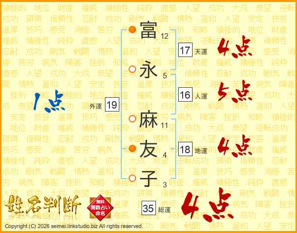 富(12画)永(5画) 麻(11画)友(4画)子(3画)