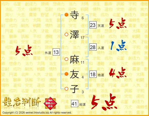 寺(6画)澤(17画) 麻(11画)友(4画)子(3画)